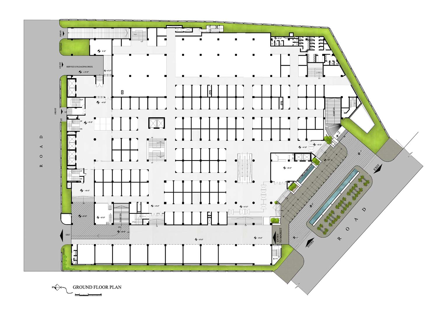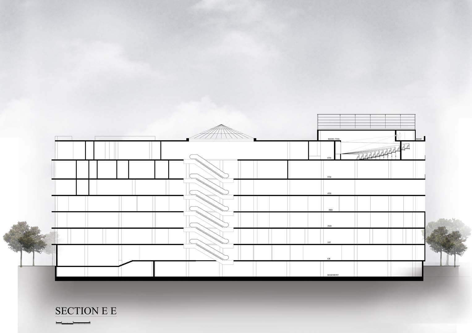 This project was a mixed used building containing shopping mall, hotel, swimming pool etc. The ground floor is designed as public friendly hospitable adorned with green, sitting space near the footpath and a soothing water body. The hotel area is more restricted. The roof consists facilities like performance, swimming pool, children play are, sauna etc. There is also an art gallery and cafeteria for the people. This project was designed to meet the confront of the combination of a mixed used building near the significant iztema site.